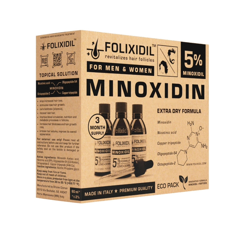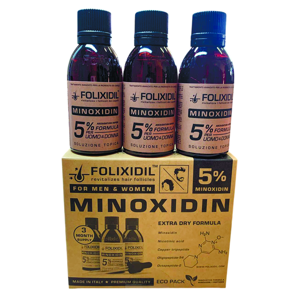 Folixidil 5% Extra dry - Обновленная формула 5% препарата из Италии. Применяется при выпадении волос на голове, а также для роста бороды и усов.Признан одним из самых лучших в своем сегменте. Основное действующее вещество (миноксидил) усилено дополнительными ингредиентами (пептидами) для более сильного воздействия.