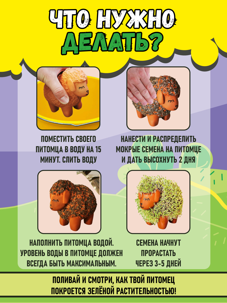 Питомец Чиа овечка - это керамическая фигурка в форме животного, покрываемая семенами чиа, которые при прорастании микрозелени напоминают шерсть. В верхней части кашпо есть отверстие, в которое заливается вода. Таким образом, вода проходя через поры в глине питает семена.
